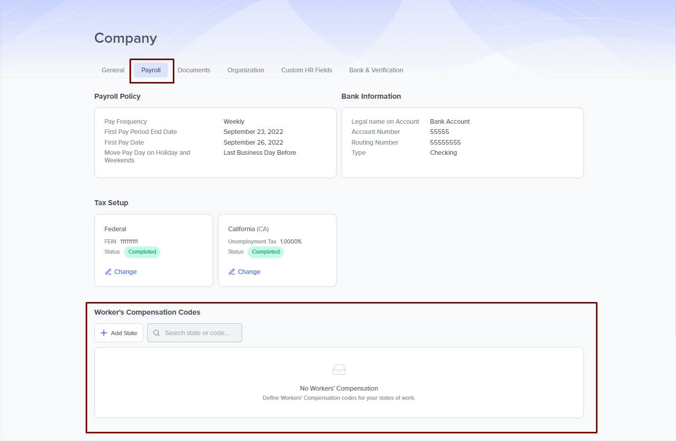 As a company admin and based on company policy, setting up Workers' Compensation is optional in the app. However, if you decide to set it up, you must set a default worker's compensation for each employee based on their work location state. You do this to ensure that the system runs your payroll successfully.