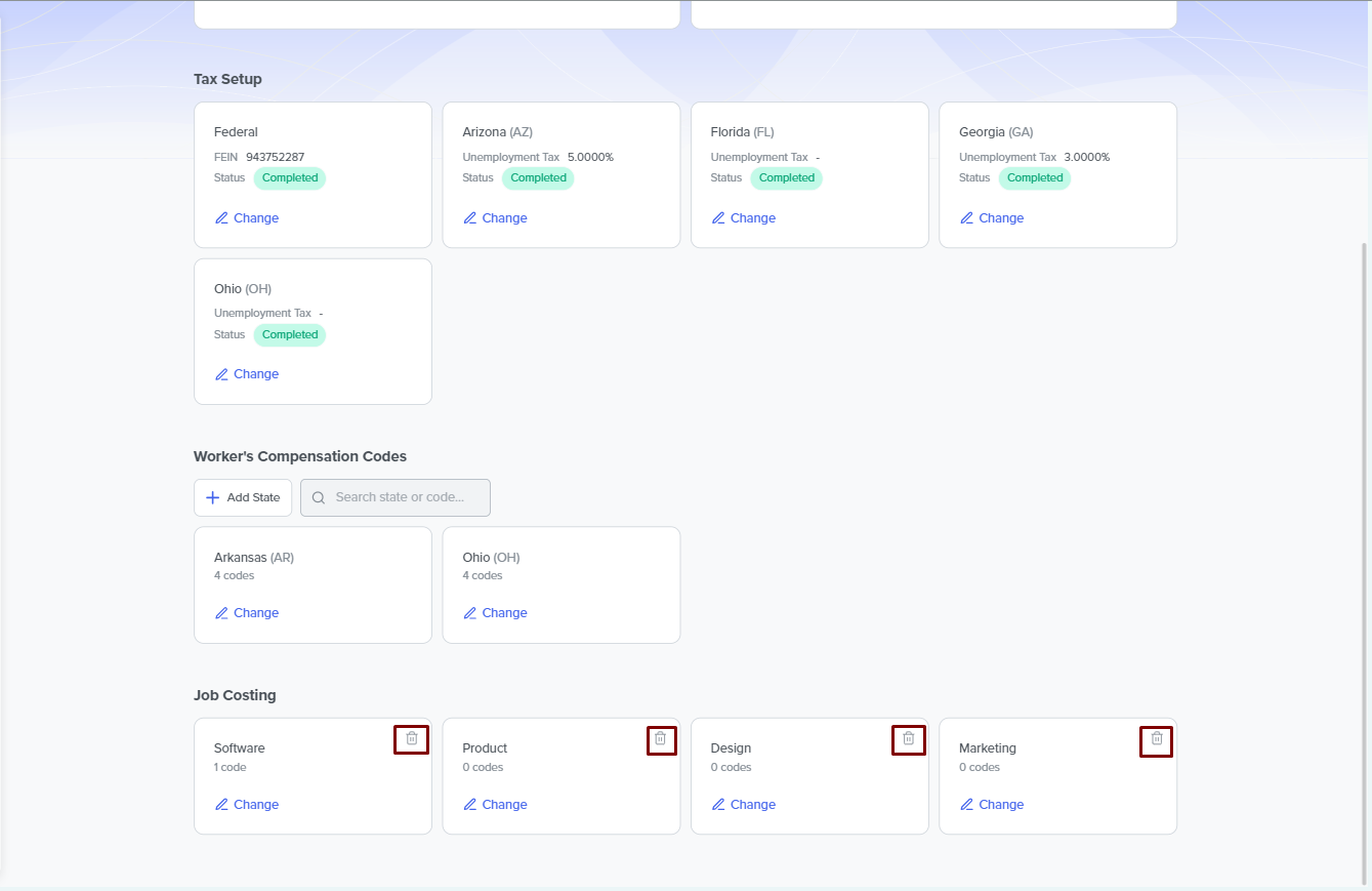 You can set up your company's job costing in the Company section of the app, which you can find the menu list on the sidebar of your dashboard. In the Company section, navigate to the Payroll tab, where you will see your job costing segments at the bottom of the page.