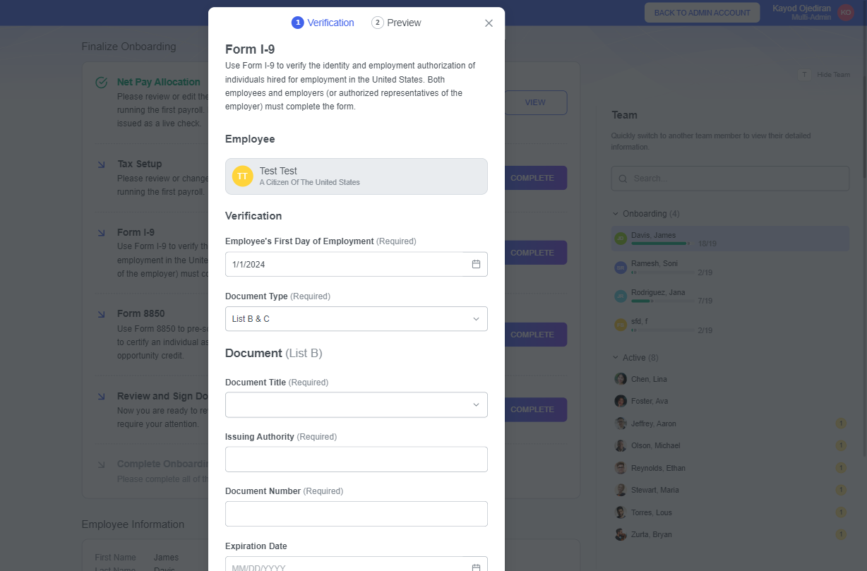 In this onboarding step, the company's admin verifies the employee's onboarded information in about five different processes depending on the onboarding option the admin chose in the first step.